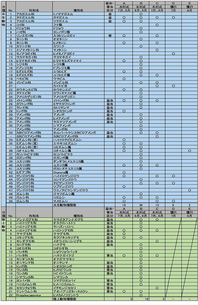 調査で確認された水生動物(注:水中で確認された種とし、例えばトンボ目の幼虫はこちらに含める)は50種、陸上動物(注:陸上で確認された種とし、例えばトンボの成虫はこちらに含める)は22種でした。種類数を県南・県北地域に分けて、表-1に示します。