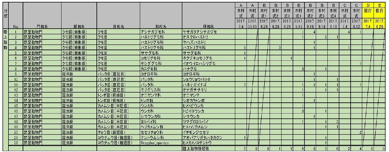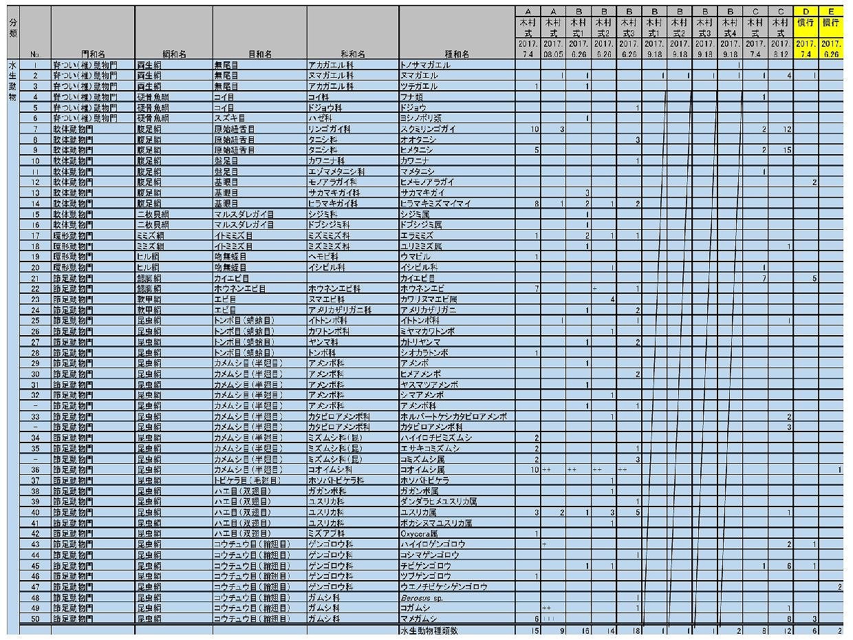 慣行の水田は水生動物のみ夏季に調査しました。Bの水田と隣接するEの農薬、肥料、除草剤を使用した慣行栽培の水田を比較すると、その種類数の違いには著しいものがありました。慣行栽培のE水田で確認された2種は自然栽培の水田Bからの水が漏れ出た所で確認されたものであり、それを除くとE水田では水生動物は確認されませんでした。