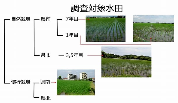 調査は自然栽培の岡山県南、県北の7年、5・3年、1年目の水田及びコントロールとして慣行栽培の水田で実施しました。