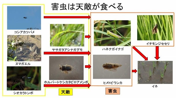 これらを直接または間接的に食べる天敵生物としては、コシアカツバメ、ヌマガエル等無尾目、ヤサガタアシナガグモ等クモ目、シオカラトンボ等トンボ目、ホルバートケシカタビロアメンボが確認されました。つまり、農薬を使わなくても天敵生物が害虫を食べてコントロールし、十分農薬の役目を果たしていると考えられます。